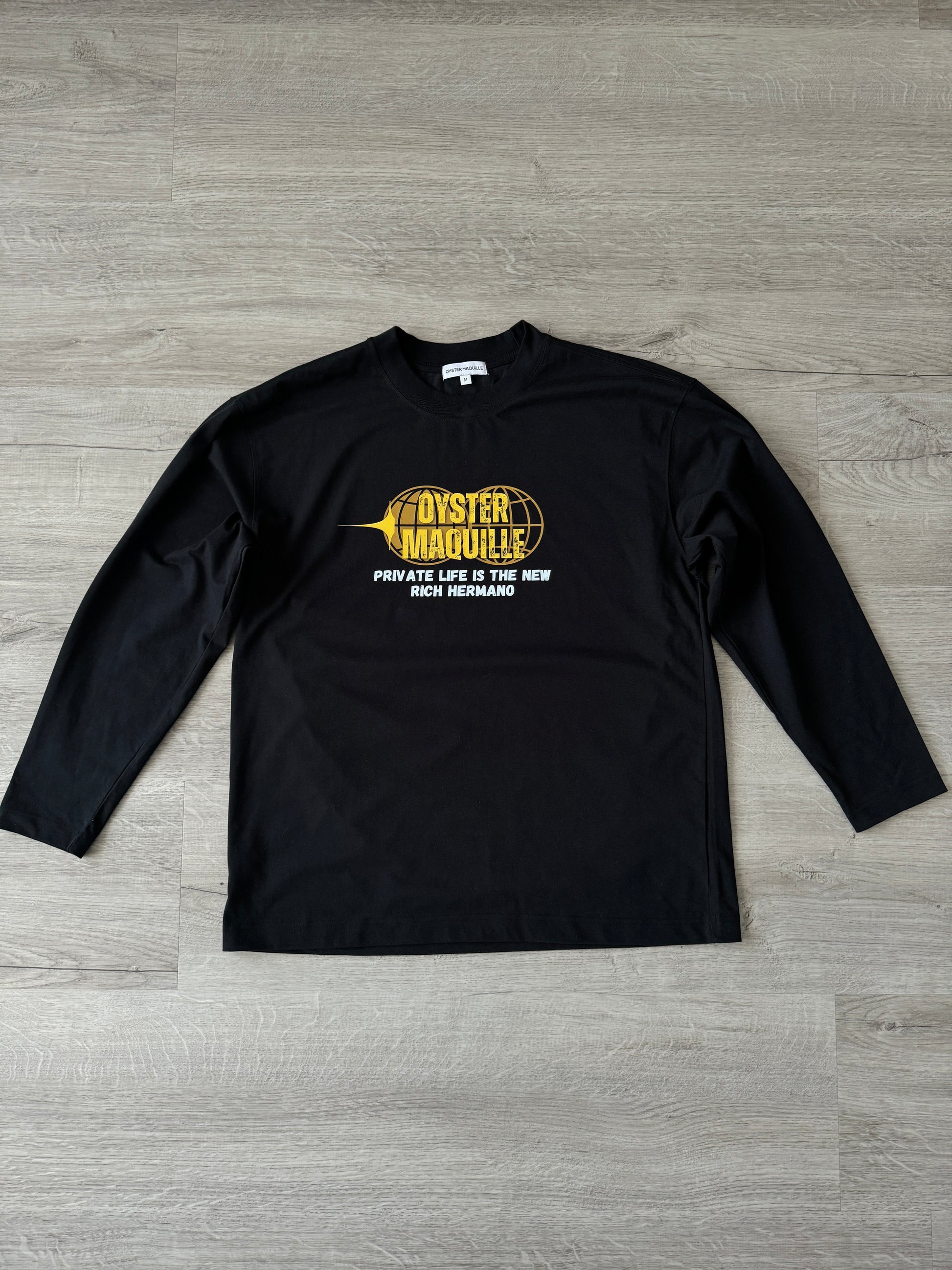 De zwarte “Private Life longsleeve” straalt stille luxe uit clean, zwaar en zelfverzekerd. De quote “Private life is the new rich hermano” zet de toon: discreet, maar met karakter. De globe op de borst geeft ‘m een flamboyante edge zonder dat het geforceerd voelt. Een stuk dat moeiteloos klasse uitstraalt kalm in houding, luid in uitstraling.